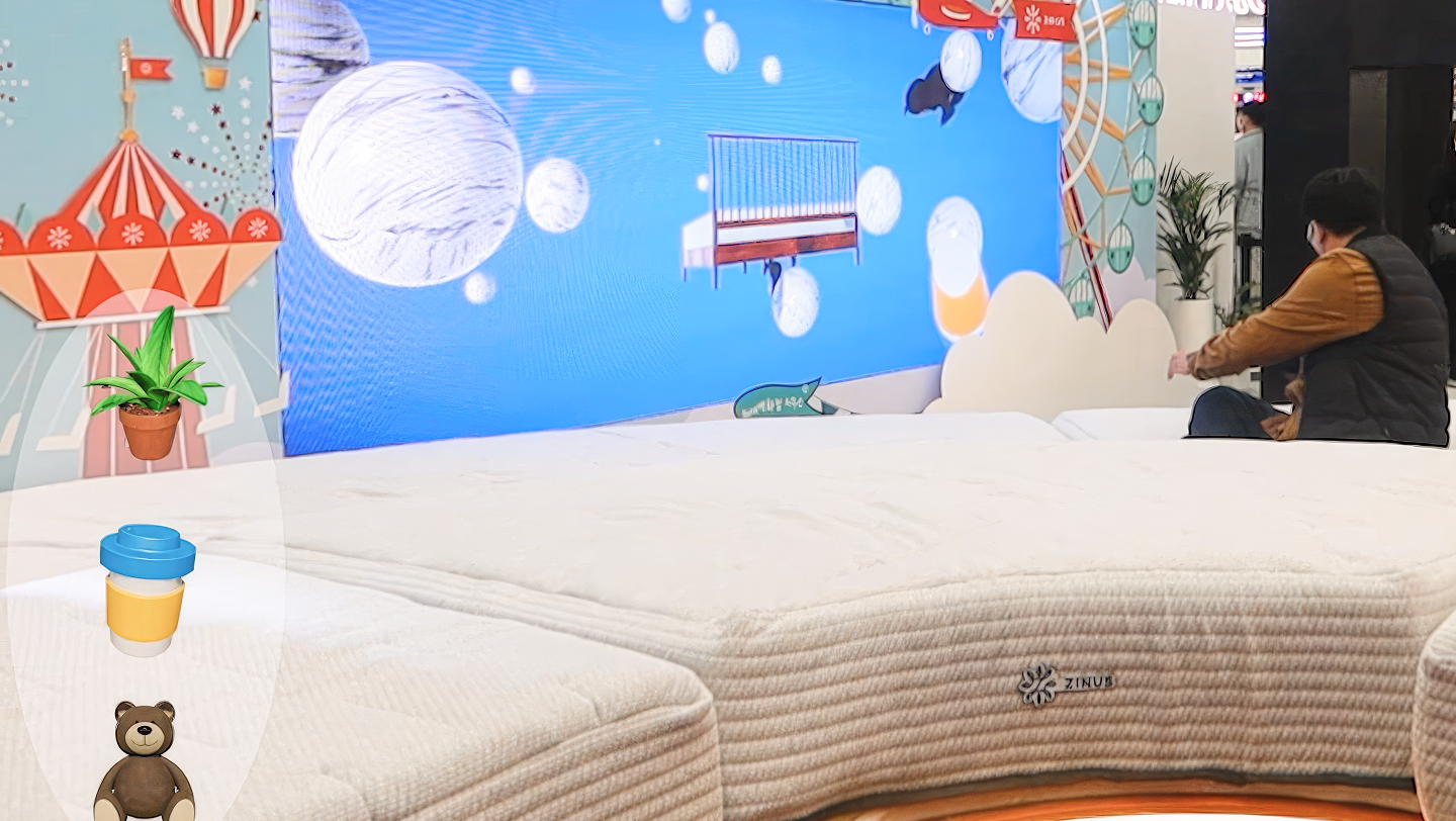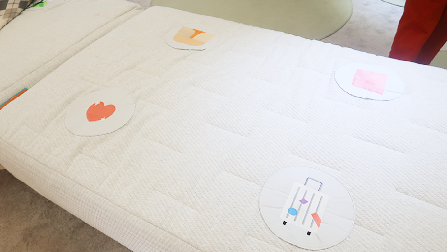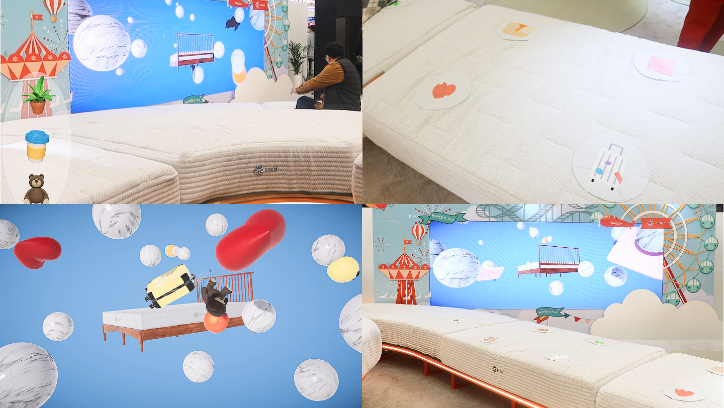 참여자가 침대 위의 오브젝트 버튼에 앉으면, 해당 오브젝트가 미디어 월 화면에 실시간으로 나타나는 연출을 구현했습니다.