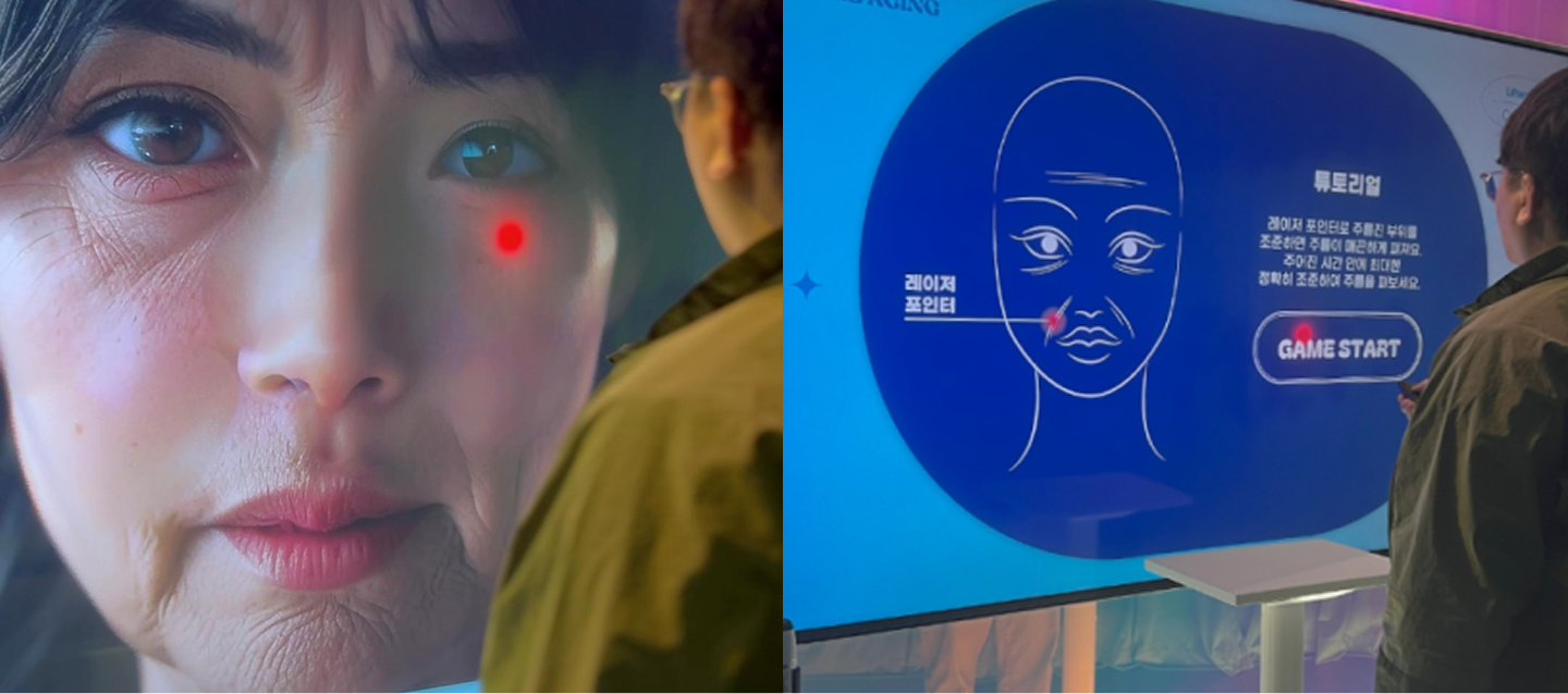 주름진 피부 부위를 리모컨으로 조준해 주름을 펴보는 인터랙티브 게임