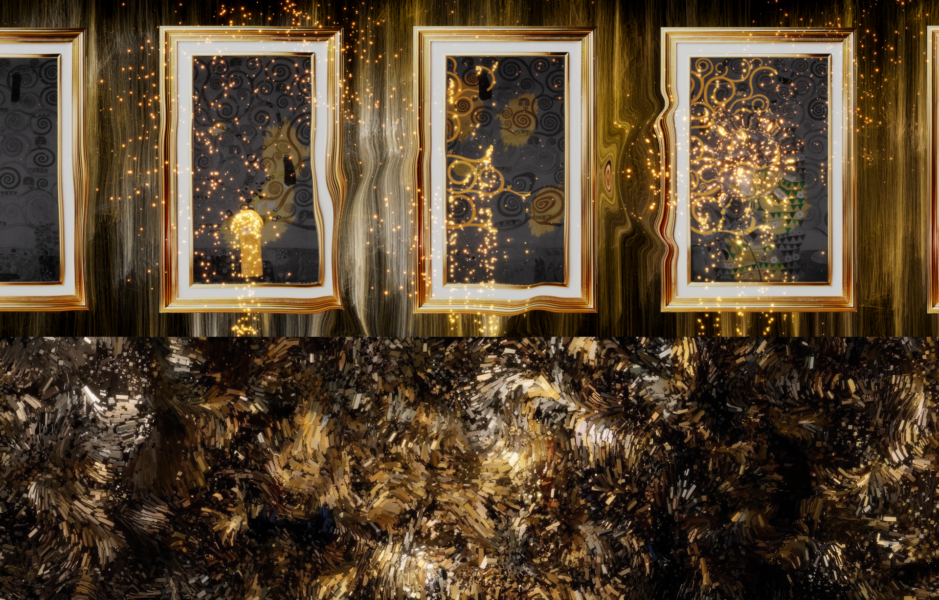 금빛 색상과 질감을 활용해 작품과 어우러지는 제너레이티브 비주얼을 제작했습니다.