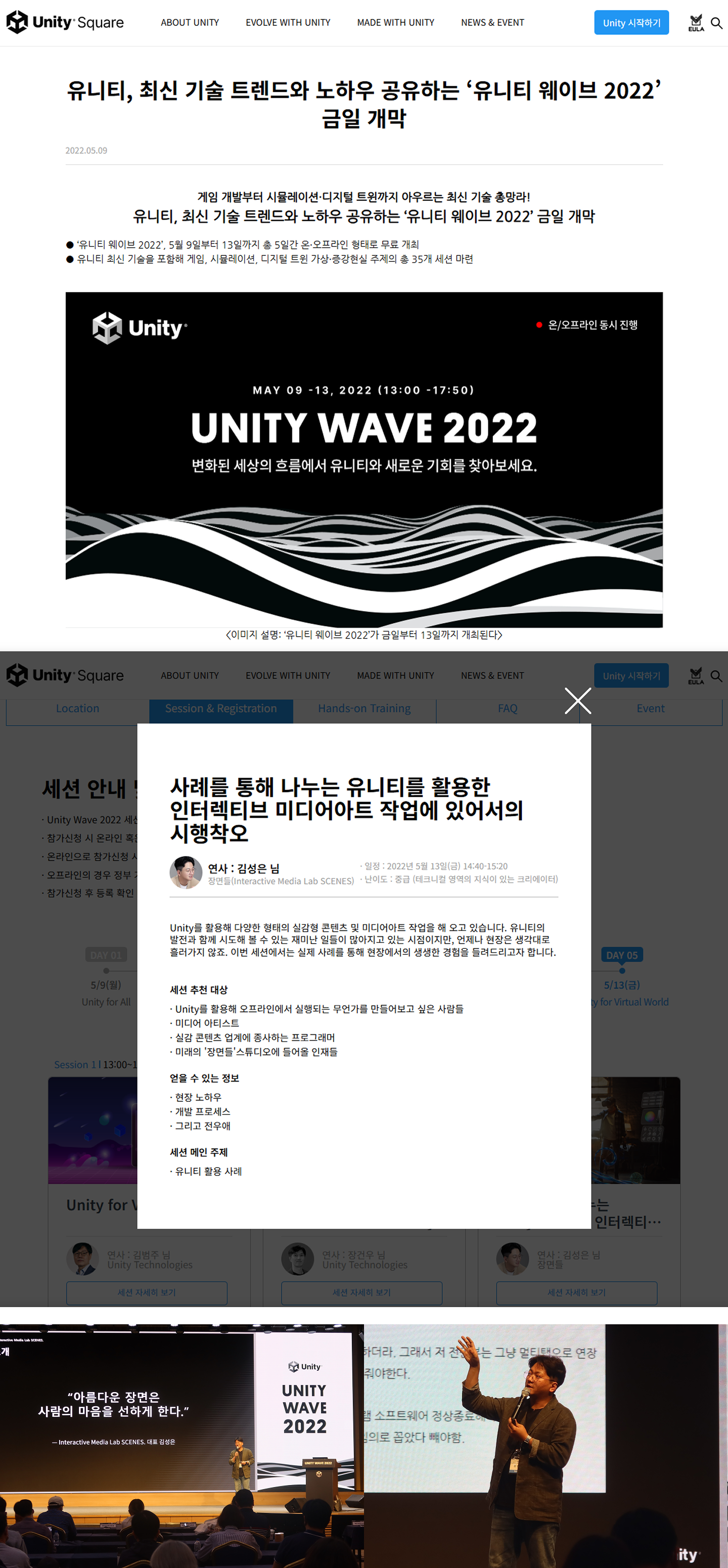 스튜디오 장면들의 김성은 대표가 ‘유니티 웨이브 2022’ 연사자로 참여했습니다. ‘사례를 통해 나누는 유니티를 활용한 인터랙티브 미디어아트 작업에 있어서의 시행 착오’라는 주제로