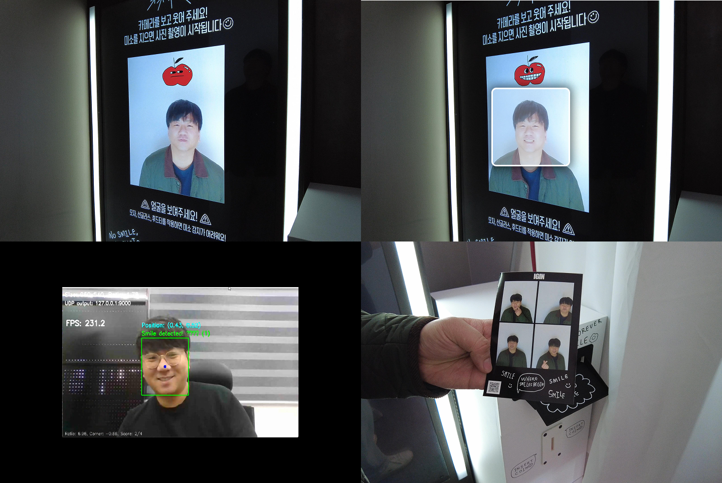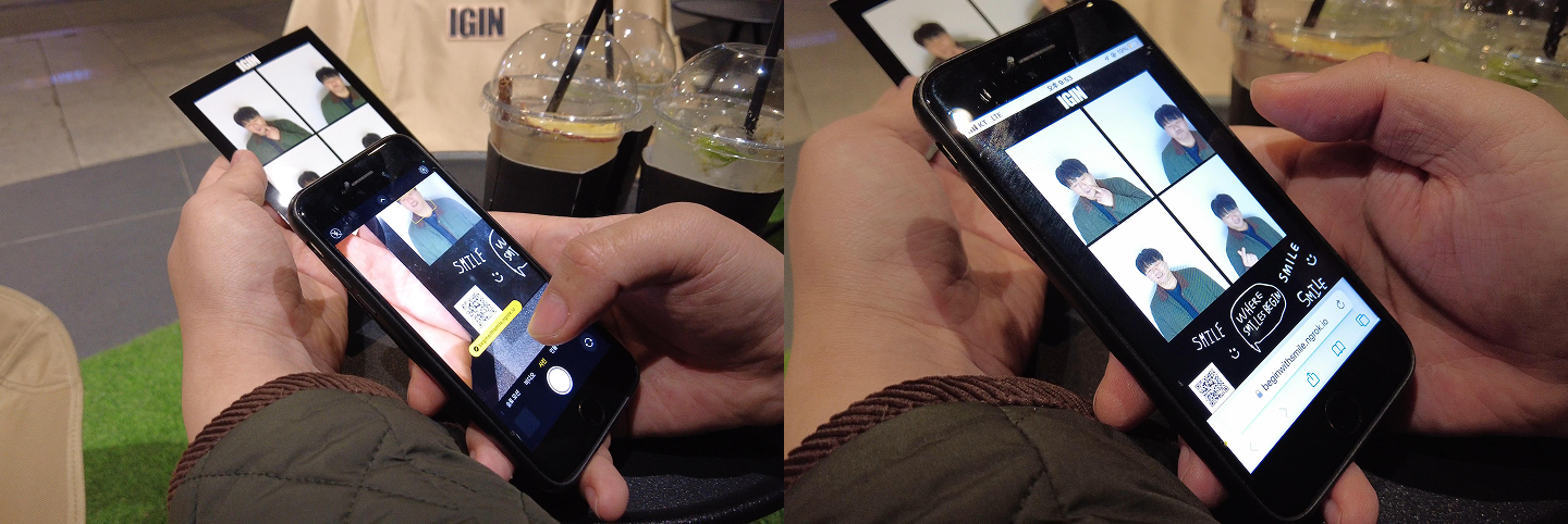 웃는 표정을 유지하면 4장의 사진이 연속 촬영되고, 현장에서 바로 출력됩니다. 촬영된 사진은 QR 코드로 생성되어 스마트폰에서 간편하게 다운로드할 수 있는 웹 서버도 연동되었습니다.