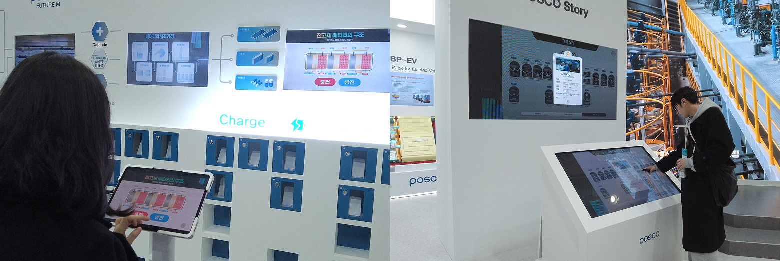 포스코의 기업 스토리를 담은 키오스크와, 태블릿-TV 연동 시스템을 통해 배터리의 작동 원리를 쉽게 이해할 수 있는 콘텐츠 개발을 담당했습니다.