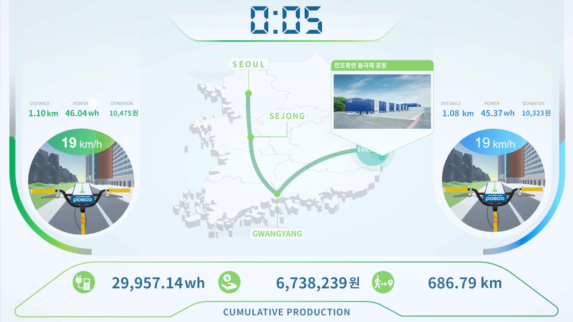 참여자의 페달링 속도에 따라 전력량, 기부금, 이동거리가 실시간으로 증가하며, 일정 기부금 달성 시 팝업창이 나타나는 연출입니다. 모든 참여자의 데이터가 누적되어 최종 합산된 금액으로 실제 기부가 이루어지며 맞춤형 사운드 디자인으로 몰입도를 높였습니다.