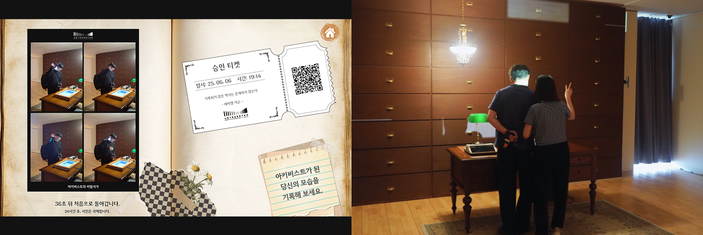 ‘아키비스트의 서재’를 컨셉으로, 참여자가 공간의 분위기 속에서 실제 아키비스트가 된 것처럼 사진을 남길 수 있는 포토 키오스크를 연출 및 제작했습니다.이곳에서 남긴 특별한 순간은 QR 코드를 통해 간편하게 저장할 수 있습니다.