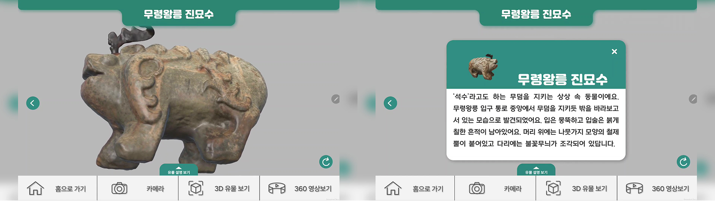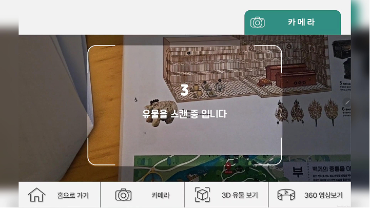 태블릿 카메라로 책 속 유물 이미지를 비추면 3D 뷰어 화면으로 연결됩니다.사용자는 3D 모델의 360˚ 모든 방향으로 회전하거나, 확대, 상세 설명 보기 기능을 통해 유물을 다각도로 탐구할 수 있습니다.
