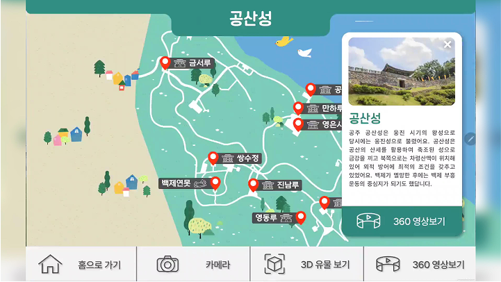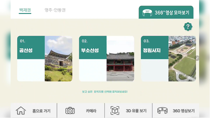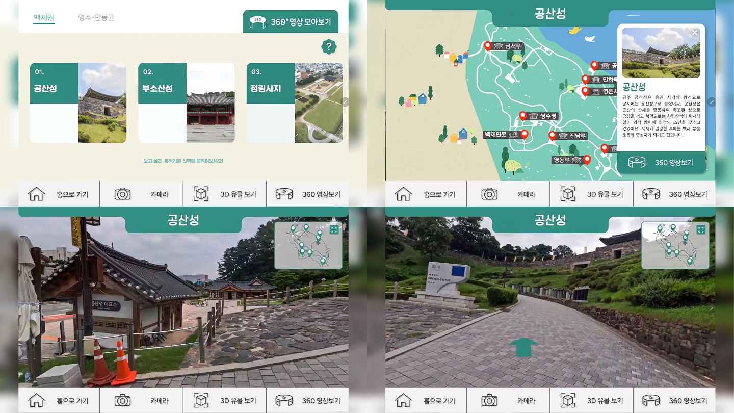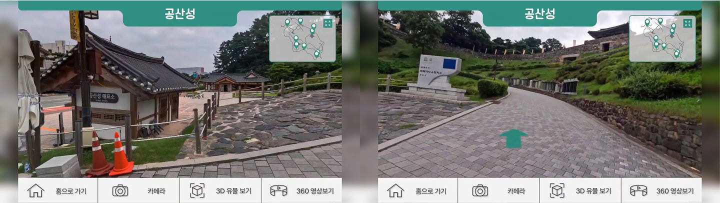 주요 유적지를 360˚ 파노라마 이미지로 체험하는 가상 탐방 콘텐츠를 제작했습니다. 사용자는 이미지를 원하는 방향으로 둘러보며, 주요 지점 간 이동이 가능한 인터페이스를 통해 현장감을 느낄 수 있습니다.