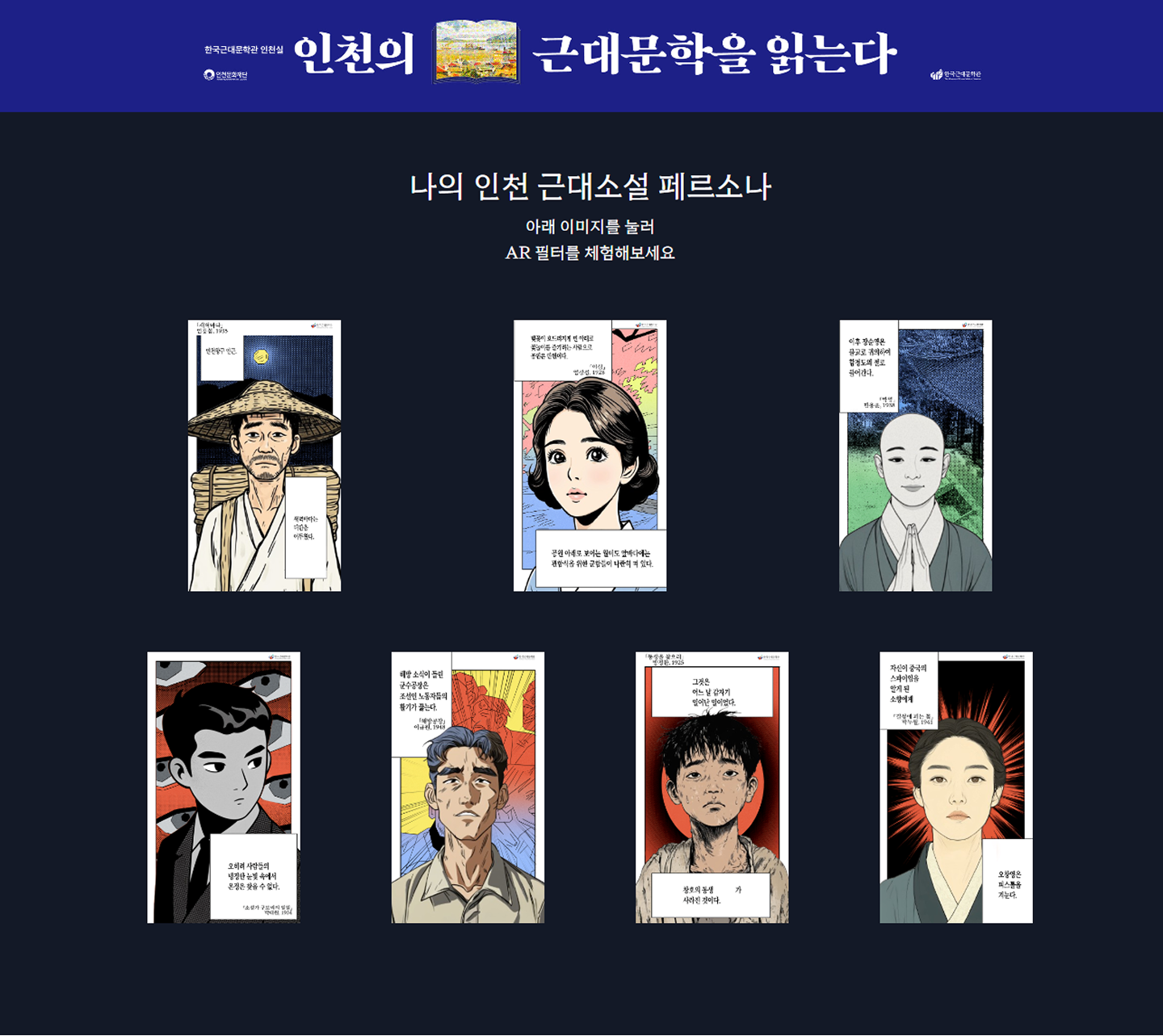 인스타그램 필터 서비스 종료로 운영이 중단된 기존 콘텐츠를 자체 솔루션으로 리뉴얼했습니다. 자체 서버 운영 방식으로, 한 번 설치로 영구 사용 가능합니다. QR 코드를 인식하여 콘텐츠를 실행하면, 사용자가 근대문학 일러스트 배경의 주인공이 되어 사진을 찍고 사진첩에 저장하는 기능을 개발했습니다.