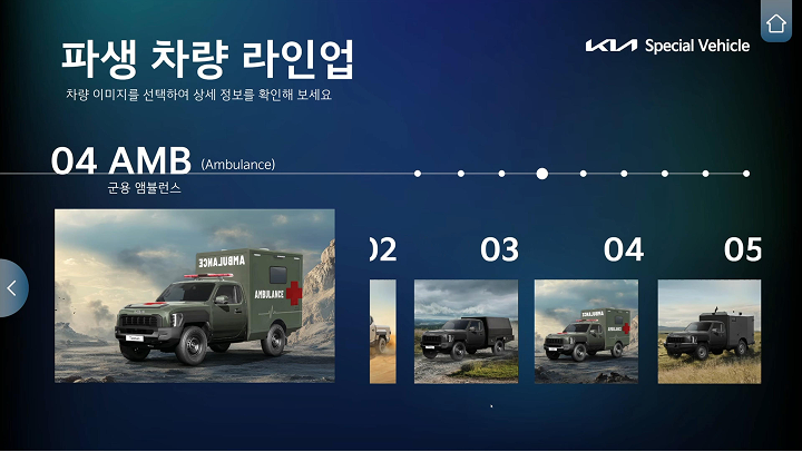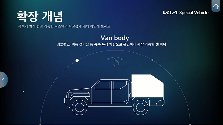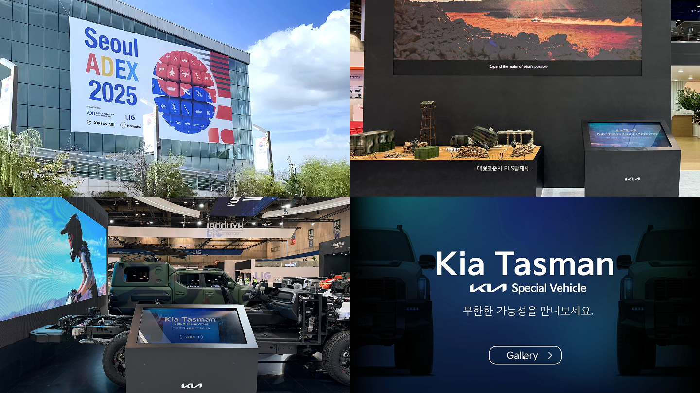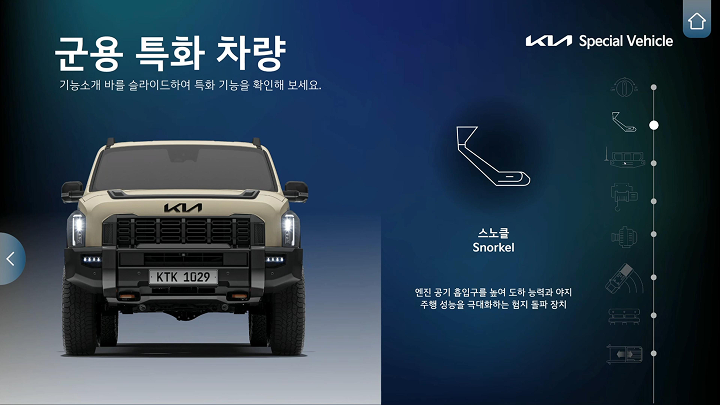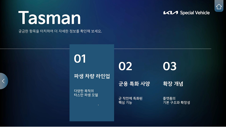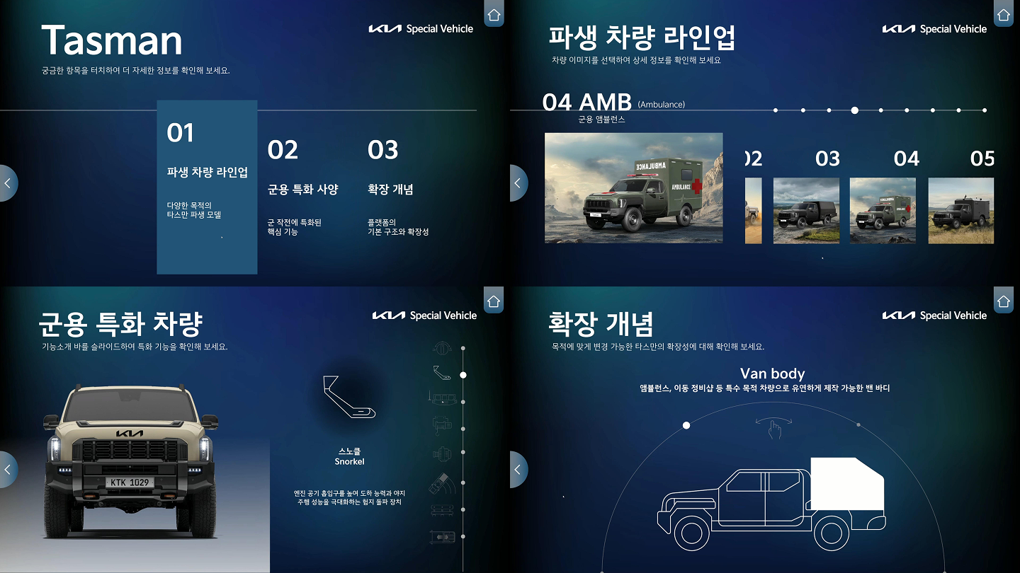 이 키오스크는 참여자가 터치하며 기아 타스만의 다양한 파생 라인업을 확인하고, 슬라이드 조작으로 군용 특화 기능, 목적에 따른 확장성 개념까지 한눈에 탐색할 수 있도록 제작되었습니다.