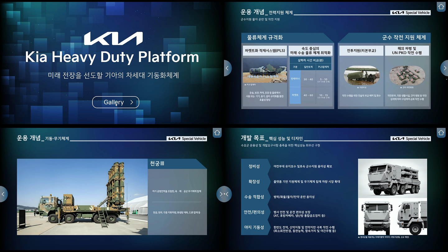 기아 차세대 기동화체계의 운용 개념 (전력 지원, 기동/무기 체계)과 개발 목표 (핵심 성능, 군 요구 충족)를 보여주는 키오스크를 제작했습니다.