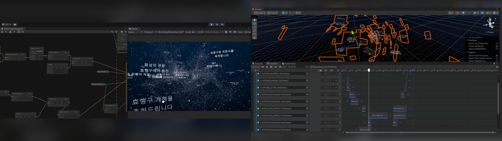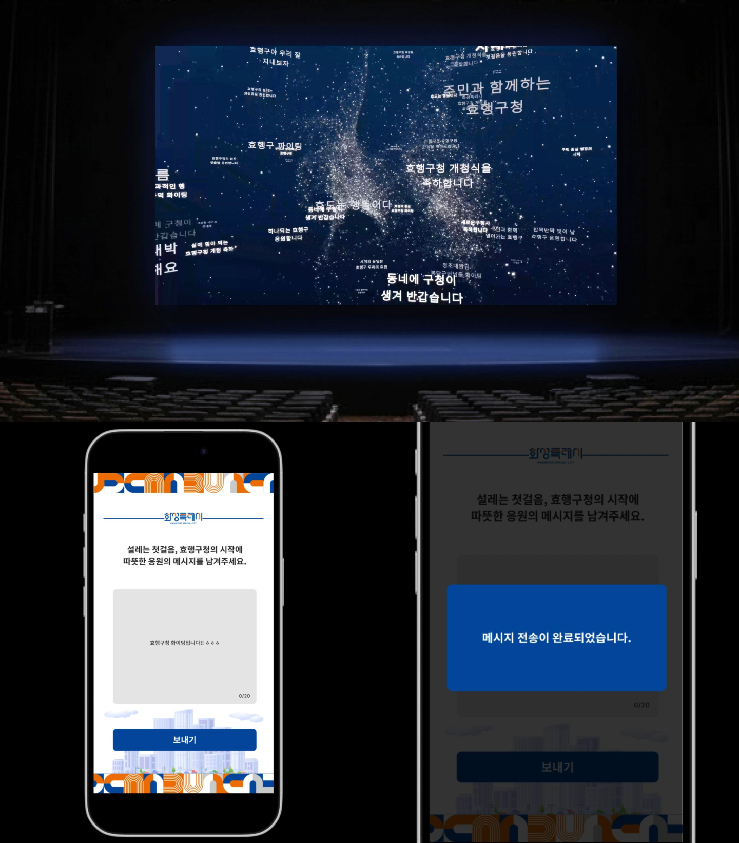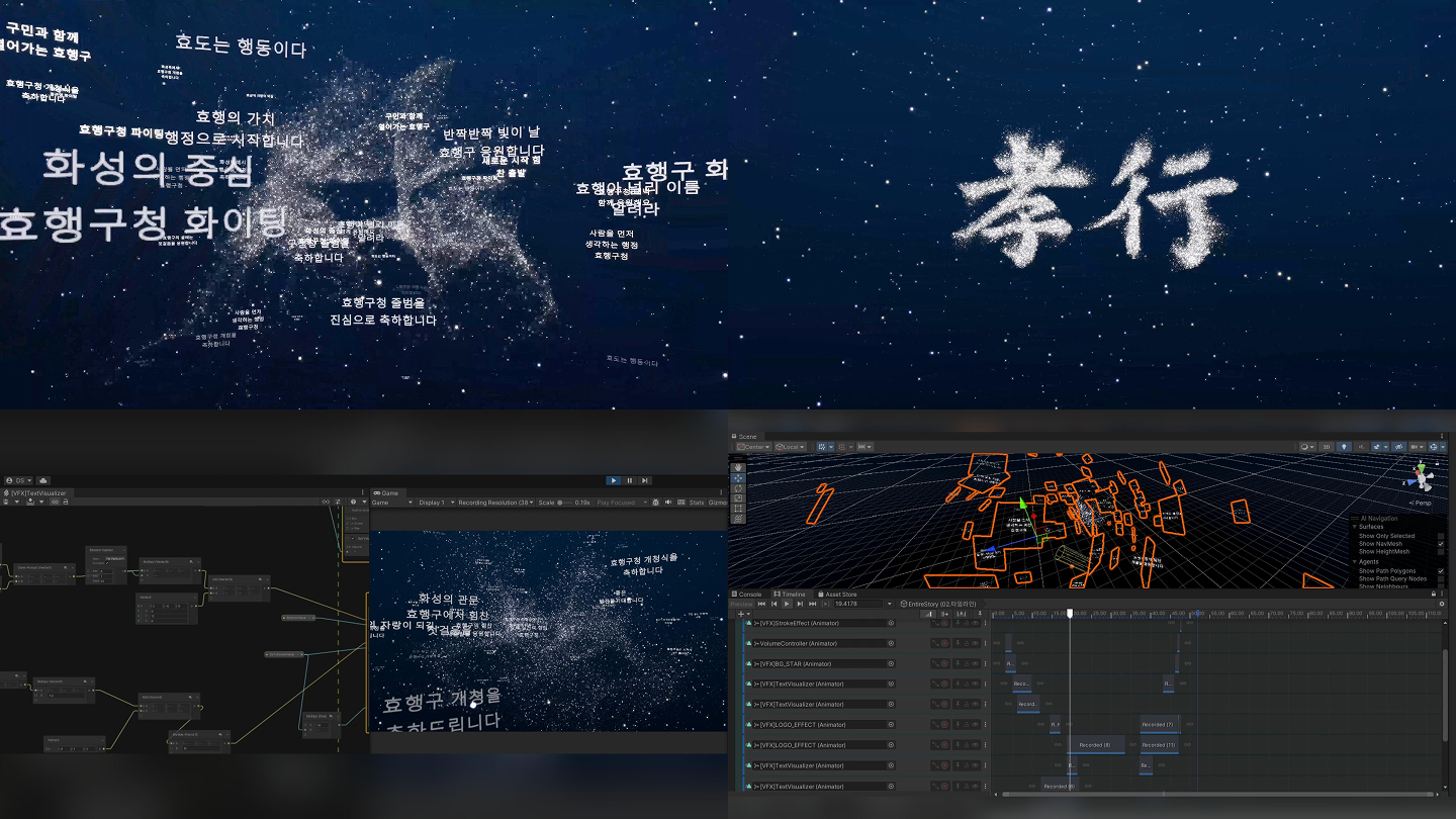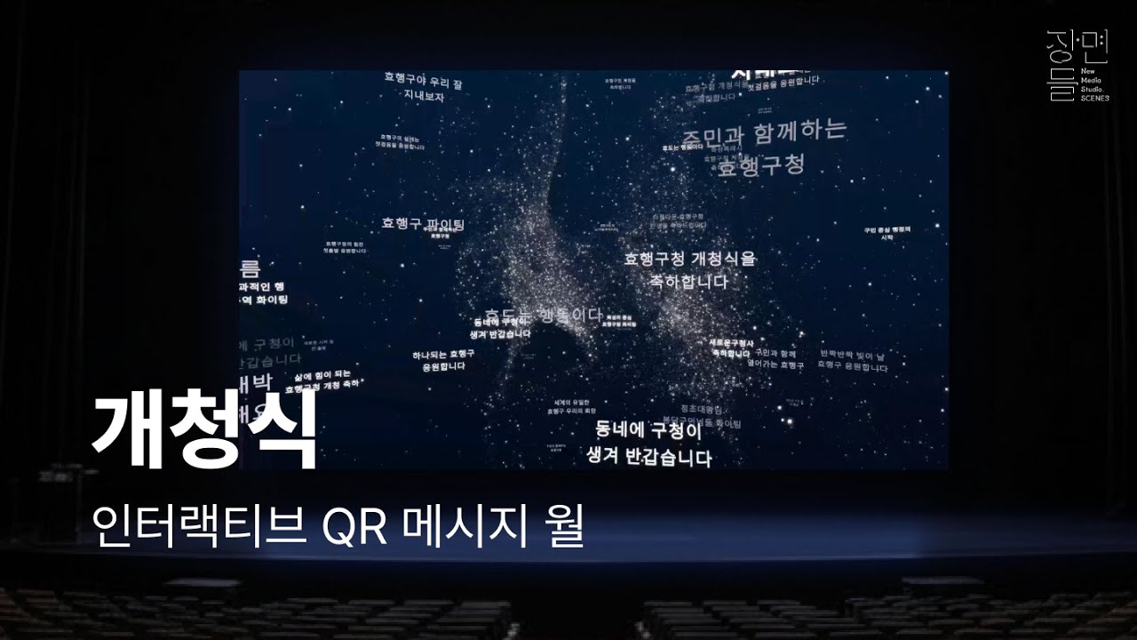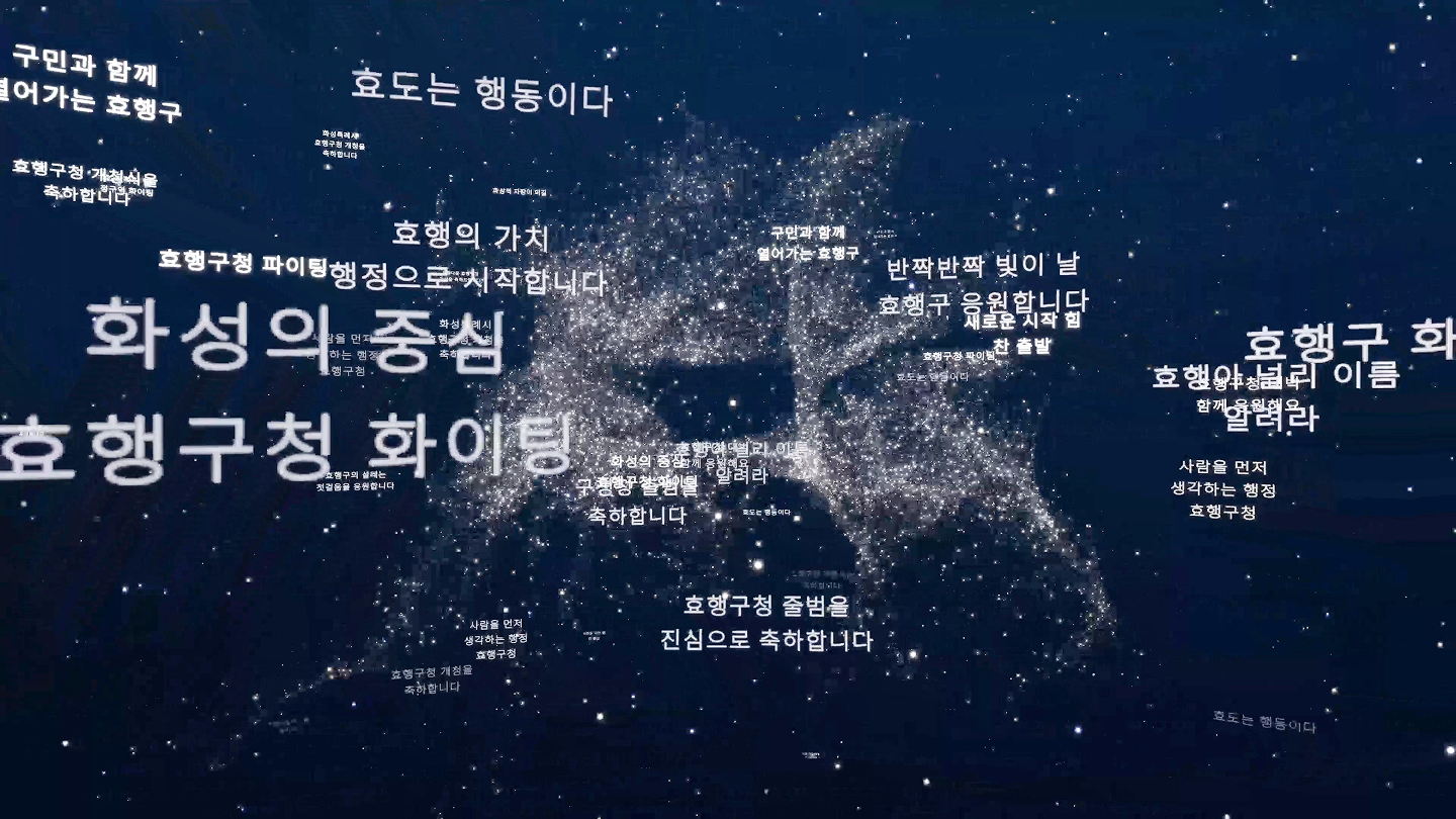 시민들이 보낸 축하 메시지가 모여하나의 작품이 되는 참여형 콘텐츠입니다.개개인의 텍스트 데이터를 시각화하여, 개청식을 함께 축하하는 의미를 미디어 월에 담아냈습니다.